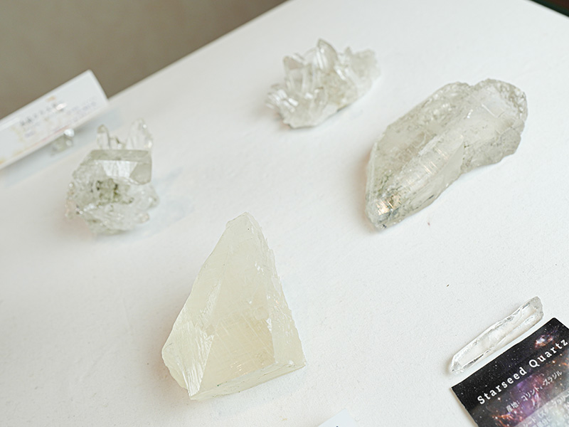 水晶クラスターも透明度が高いものからかわいい手のひらサイズまで展示。
