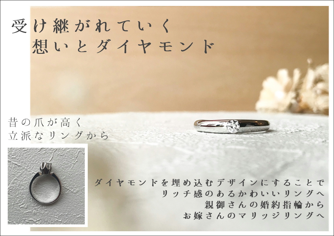 デザインが古くなったリング、眠ったままのネックレスや、旅先で買ったルースなど「ジュエリーリフォーム」するお品を当店までお持ちください。